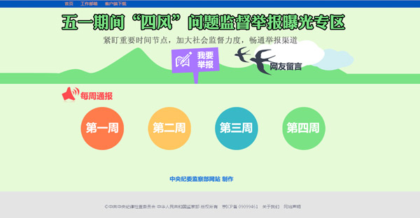 “五一”临近,为贯彻落实十八届中央纪委第五次全会精神,继续抓住重要时间节点,紧盯“四风”新形式、新动向,狠刹公款吃喝、旅游、送节礼等不正之风,加大社会监督力度,畅通举报渠道,中央纪委监察部网站于4月13日推出“五一”期间“四风”问题监督举报曝光专区。