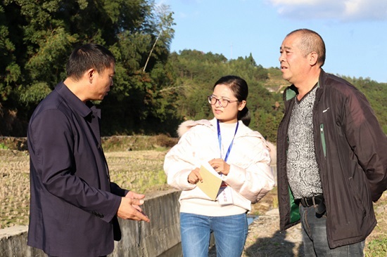 阮海燕,福建省柘荣县纪委常委、信访室主任。2017年被评为“福建省纪检监察系统先进工作者”。图为阮海燕(中)深入到富溪镇洋尾村精准扶贫户家的茶园,了解扶贫资金到位情况。