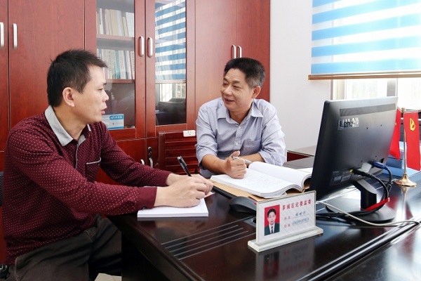 图为张世洪(右)与科室同事在商讨相关工作。