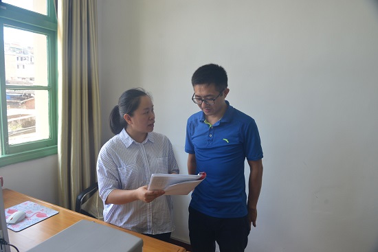 黄水银,福建省将乐县纪委常委,案件监督管理室主任。2017年9月,被评为福建省纪检监察系统先进工作者。图为黄水银(左)与同事在探讨工作。(杨玉根 摄)