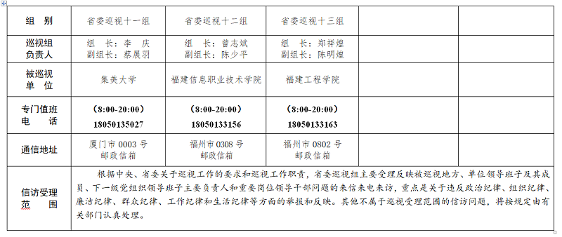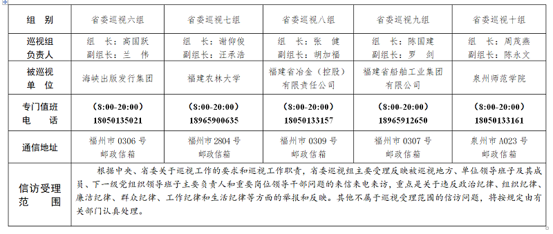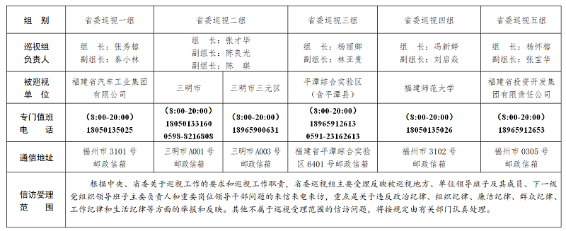 根据《中国共产党巡视工作条例》及中央、福建省委关于巡视工作的部署要求,经省委巡视工作领导小组同意,从5月上旬开始,省委巡视组对三明市、平潭综合实验区(含平潭县)、三明市三元区,福建师范大学、福建农林大学、集美大学、泉州师范学院、福建工程学院、福建信息职业技术学院、海峡出版发行集团、福建省投资开发集团有限责任公司、福建省船舶工业集团有限公司党委,福建省冶金(控股)有限责任公司、福建省汽车工业集团有限公司党组开展常规巡视。对设区市的巡视时间2个月左右,对省属高校、省属国有企业、县(市、区)巡视时间40天左右。日前,13个巡视组已进驻巡视。