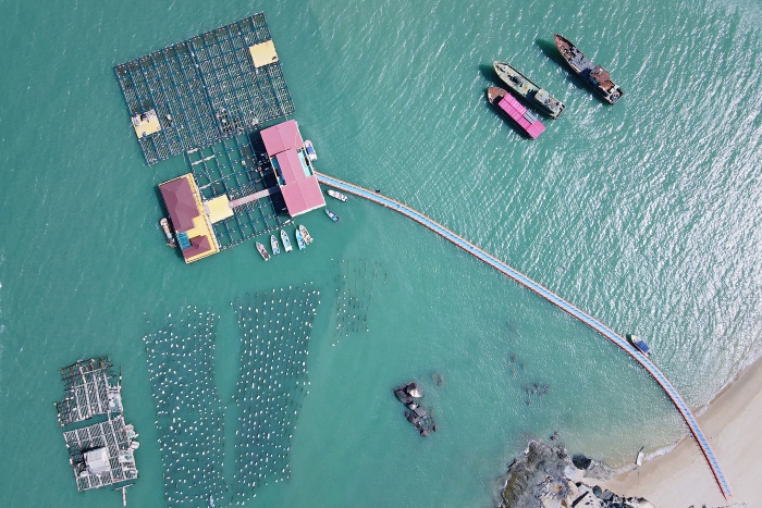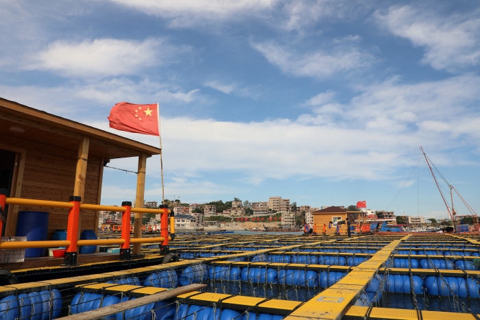初夏的海边,伴着海风习习,涛声阵阵。在泉州市泉港区南埔镇惠屿村海上养殖升级改造示范区,黄蓝相间、整齐壮观的新型渔排与碧海蓝天、飘扬的红旗共同组成一道渔旅相宜的海上田园风光。