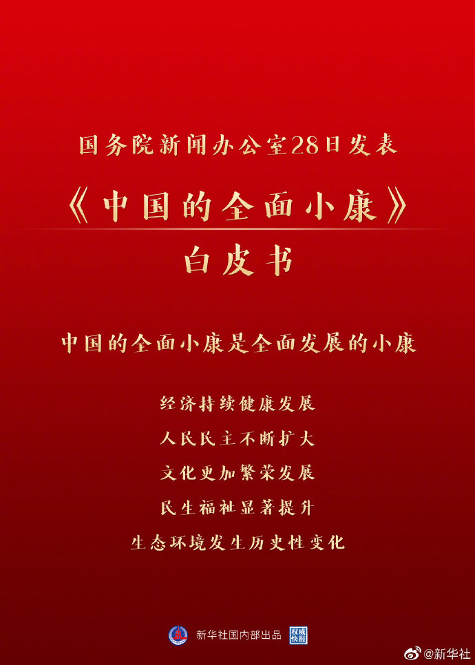 新华社北京9月28日电 国务院新闻办公室28日发表《中国的全面小康》白皮书。