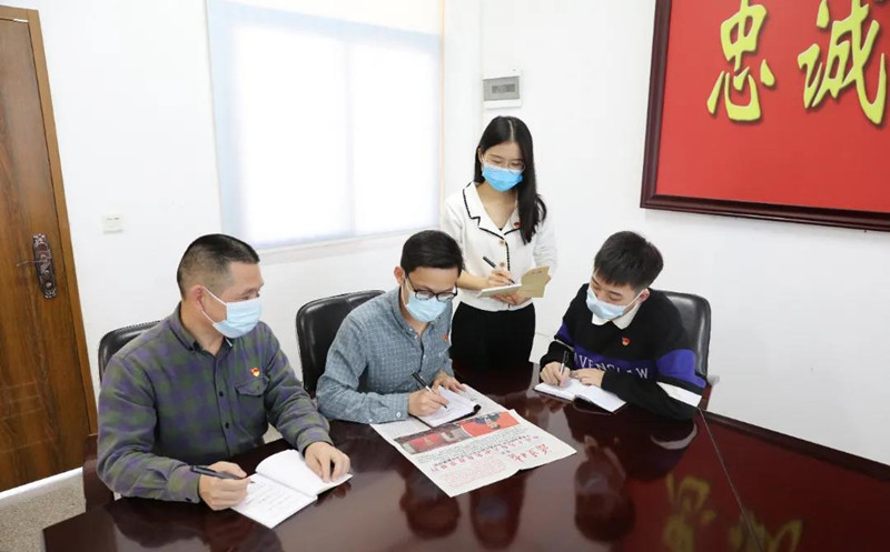 南安市纪委监委干部以小组形式阅读报刊学习全会精神(张维丹 摄)