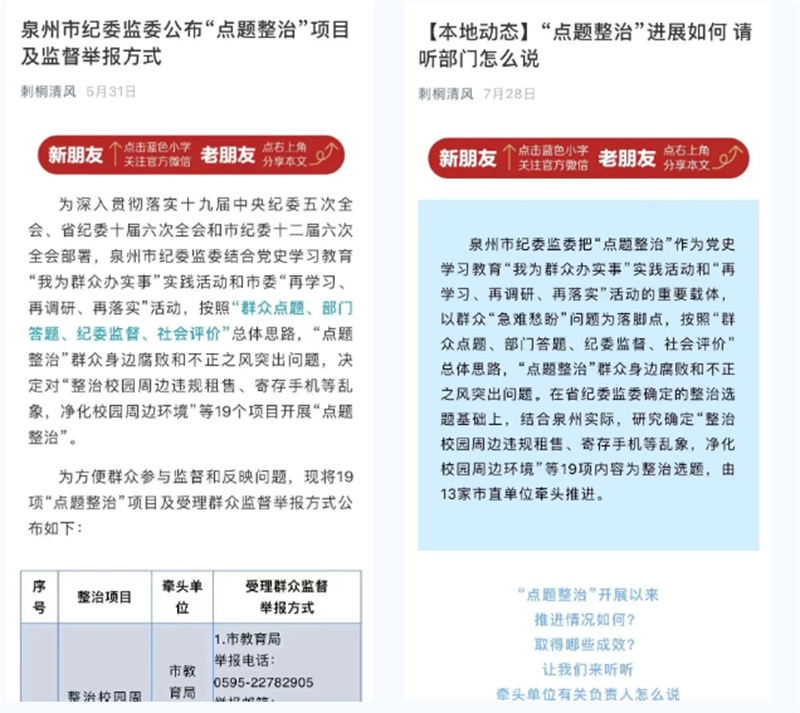 2021年,“刺桐清风”微信公众号公布“点题整治”项目和工作进展情况。