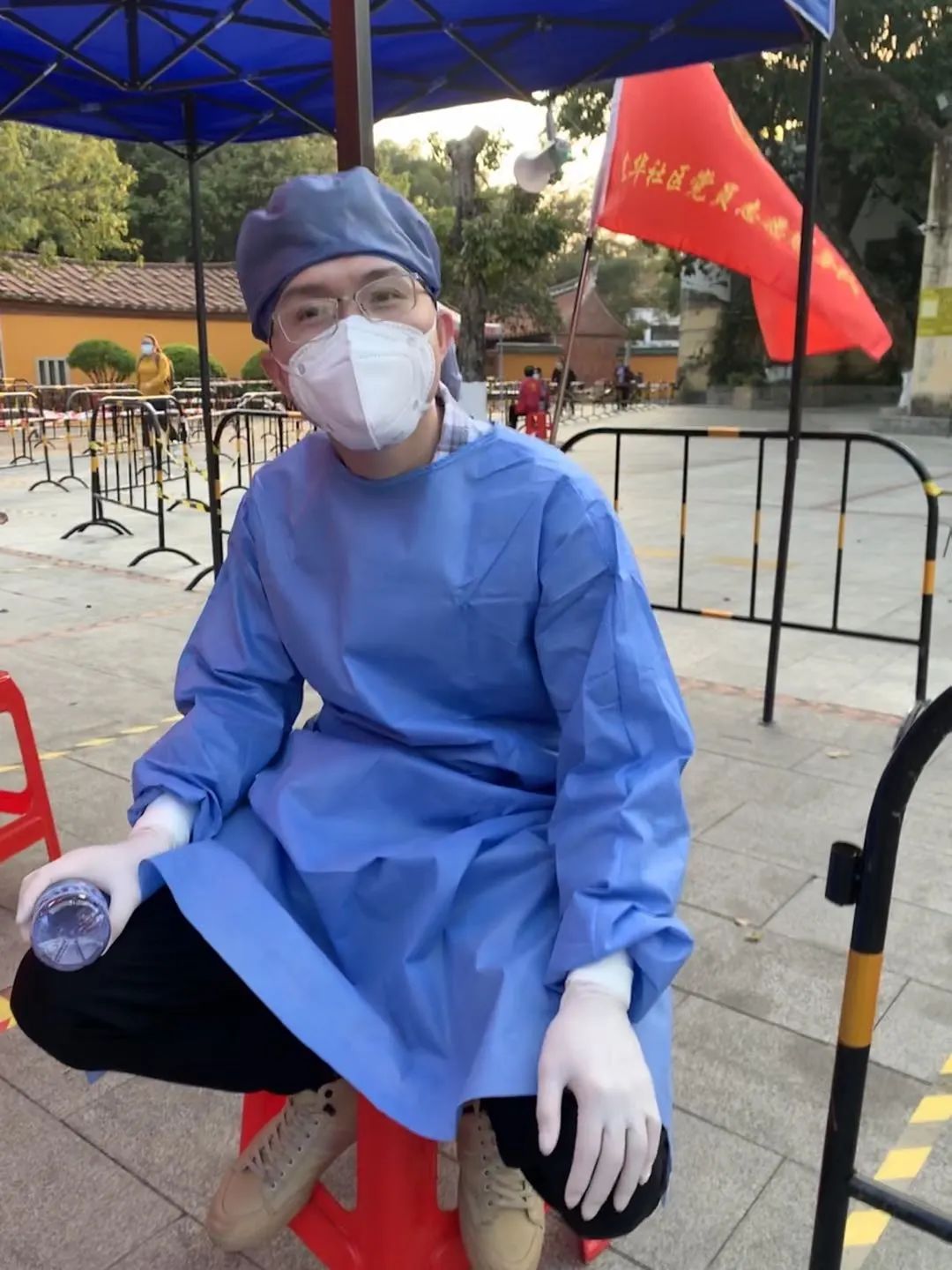 林逸凡在东华社区协助开展核酸检测工作时稍作休息