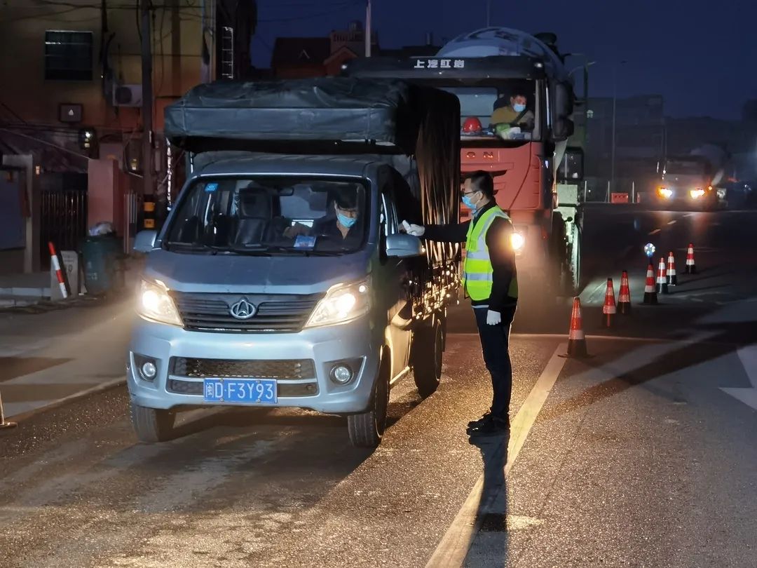 黄文彪(右一)在交通查验点对司乘人员进行体温检测、“三码”联查