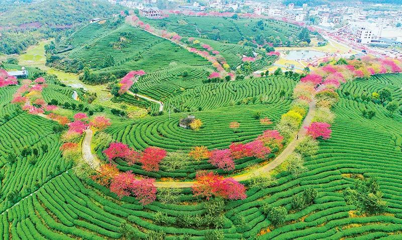 福建深化生态省建设,打好污染防治攻坚战,有序推进碳达峰碳中和工作,水、大气、生态环境保持全优。图为2022年2月4日,漳平市永福镇台品樱花茶园的樱花竞相绽放。人民图片 王闽/摄
