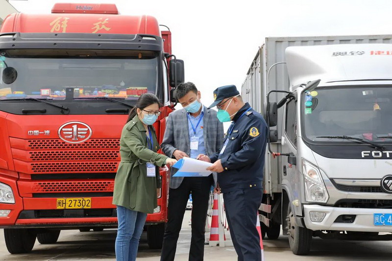 泉港区纪委监委派出督导组工作人员在泉港区入泉生产生活物资运输中转站查看人员值班值守、物资储备、消杀流程等情况。(蔡珍妮 摄)