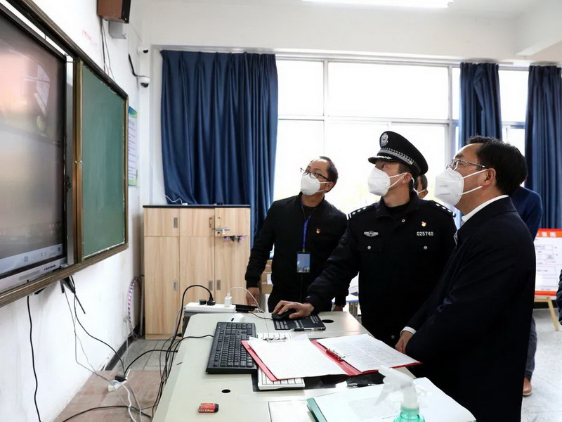 4月2日,市委常委、市纪委书记、市监委主任傅藏荣(右一)到德化职业技术学校医学隔离观察点了解人员管控、环境消杀、监控系统运行等防疫措施落实情况。(吴朝烨 摄)
