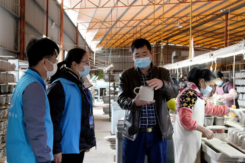 德化县三班镇纪委监察组干部到第一批复工复产重点企业宏顺陶瓷有限公司了解需要监督推动解决的问题(叶珠红 摄)