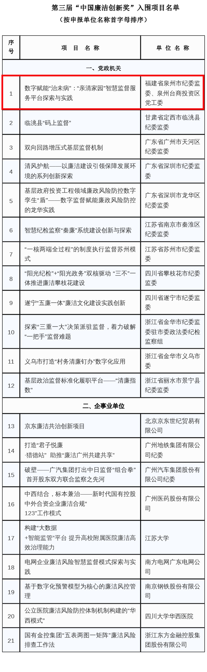 7月11日,第三届“中国廉洁创新奖”入围项目名单公示,泉州市纪委监委、泉州台商投资区党工委选送的《数字赋能“治未病”:“亲清家园”智慧监督服务平台探索与实践》榜上有名。