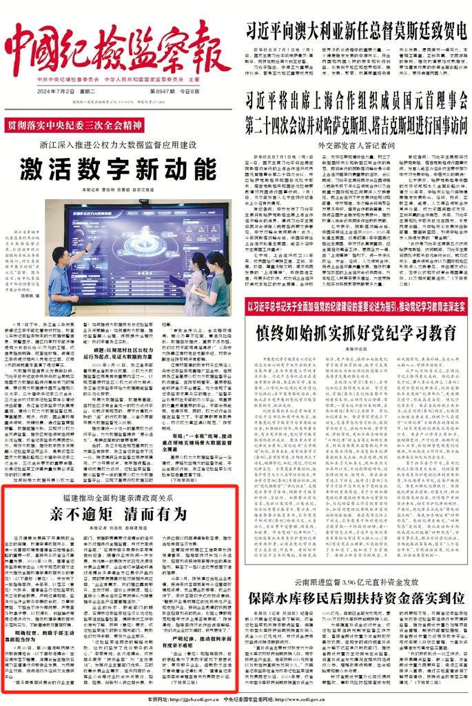 7月2日《中国纪检监察报》头版报道了福建推动全面构建亲清政商关系 亲不逾矩、清而有为的经验做法