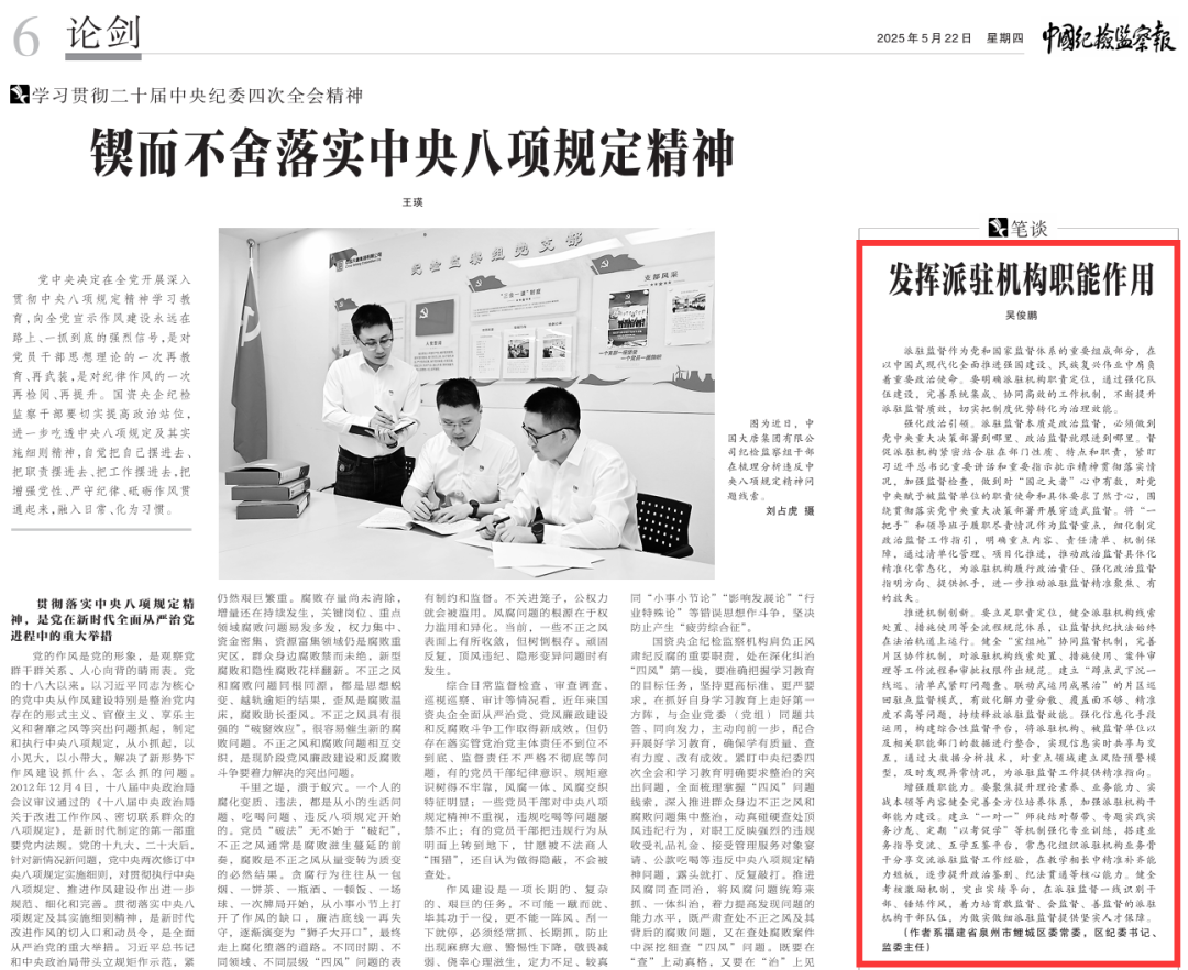 5月22日,《中国纪检监察报》第6版刊发了鲤城区委常委,区纪委书记、监委主任吴俊鹏的署名文章《发挥派驻机构职能作用》,中央纪委国家监委网站全文转发。