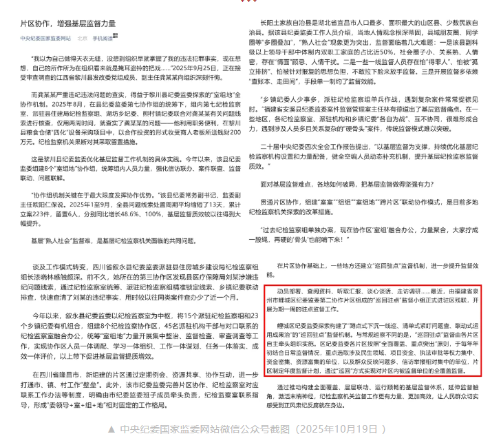 在片区协作基础上,一些地方还建立“巡回驻点”监督机制,进一步提升监督效能。